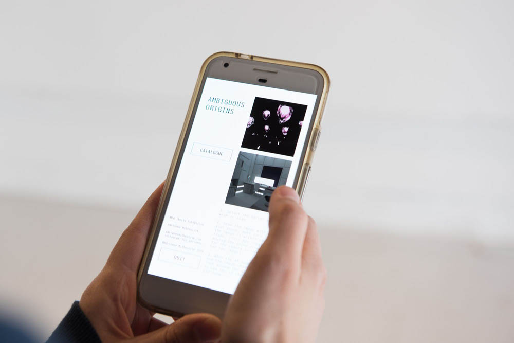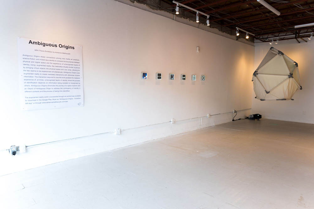 Ambiguous Origins is an exhibition exploring the boundary between the physical and the digital through augmented reality, installation and film. Drawing connections among science fiction, new media and mixed-race identity, Ambiguous Origins chronicles the journey of a space explorer and an Object of Ambiguous Origin (O.A.O). The works address the contingency of identity in different contexts and the process of being (mis-)identified.