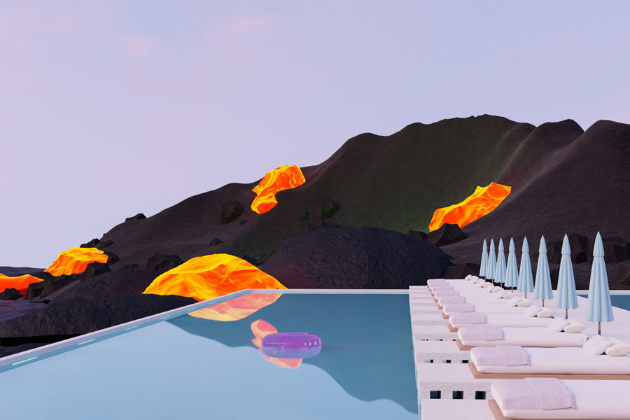 "As a technology that blurs the boundaries of virtual and physical as well as reality and fiction, AR lends itself to science fiction. Adrienne Matheuszik’s Proxima-B (2021) capitalizes on AR’s world-building capacity. This body of work consists of an outdoor billboard and an indoor pop-up travel agency. Located on Dupont Street, just west of InterAccess, the billboard depicts all the trappings of a luxury resort against an exotic intergalactic terrain. The picturesque destination is a remote, uninhabited place where time passes slowly. These qualities can also be observed in the postcards featured in the travel agency, which depict the same luxurious pool, a hotel room with a superior view of the extraterrestrial landscape, and a serene private patio. Proxima-B imitates and deconstructs the visual strategies of social media travel marketing. The tourist imagery seen in Matheuszik’s work has a legacy rooted in the colonial project of presenting travel destinations as vacant, devoid of local inhabitants, and thus ready for consumption. Upon activating the AR image markers, these images of a fantasy getaway reveal a dilapidated resort that has been taken over by otherworldly decay. The artist deliberately denies the viewer visual, mental, and physical access to this resort, planet, and future. Instead, beholders must stay where they are and remain accountable to the environmental, social, and political ailments of our present moment."